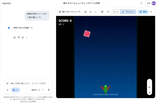 そして、改良もプロンプトで。例えば「自機を西洋ファンタジー風の竜にして」などと入力すればOKです。