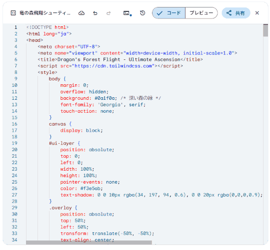 なお、ここまでの文章で「プログラムコード」の話は一切出ていませんが、実際の過程でも「プログラムコード」は全く触っていません。画面にある[コード]を選択するとプログラムコードは見られますが、コードを見なくてもGeminiにお願いすれば改良できるし、下手に触ったらバグをつけそうだし、万一バグが出てもGeminiに直してもらえるので、触る必要性は確かになさそうです。