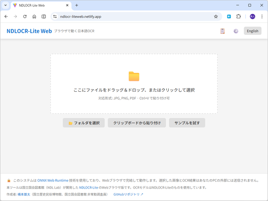 NDLOCR-Lite をWebブラウザに移植した「NDLOCR-Lite Web」を公開しました。https://t.co/IJIIAewqUOブラウザ上で手軽に画像やPDFのOCR処理を試すことができます。