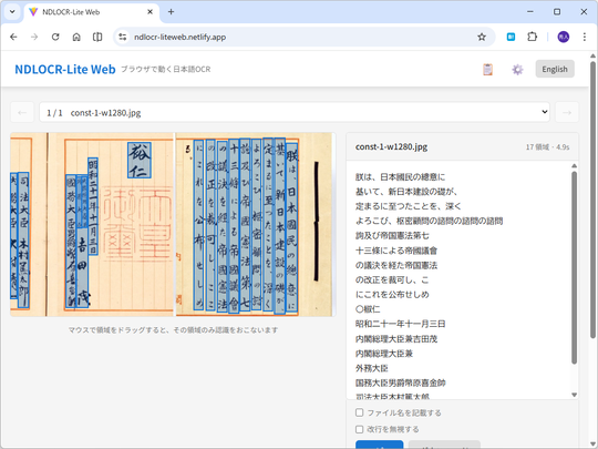 これが早速、Webアプリ(ndlocr-liteweb.netlify.app)へと移植されたのだそうです。わざわざアプリをインストールしなくても、Webブラウザーさえあれば画像からテキストを取り出せます。