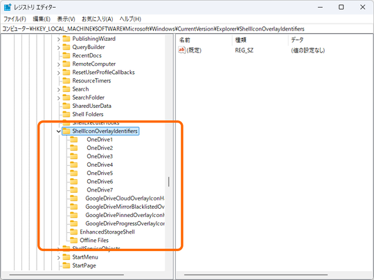 たとえば「OneDrive」は7個のオーバーレイ画像を登録していますが、レジストリエントリの名前の頭には半角空白が5つも挿入されています。だいぶセコいですが、そのおかげでリストの上位を独占できています。