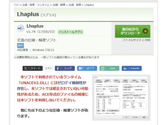 「Lhaplus」は窓の杜ライブラリの圧縮・解凍ソフトの中で、10年以上の長きにわたって1番PV数が多いソフトでした。ただし、「Lhaplus」には、紹介ページにも記載しているように、利用されているランタイム「UNACEV2.DLL」にゼロデイ脆弱性が存在し、修正されていない可能性があるというセキュリティ上懸念があります。
