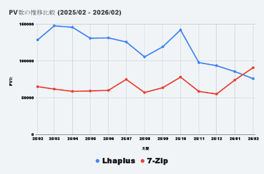 長年、窓の杜ライブラリのPV数で不動の1位を守り続けてきた圧縮・解凍ソフト「Lhaplus」。徐々にPV数を落としており、2025年には1位の座から陥落したものの、PV数ランキングトップ5を常にキープ、圧縮・解凍ソフトの中ではNo.1の座を守り続けてきました。しかし、2026年2月の月間PV数でついに同じ圧縮・解凍ソフトである「7-Zip」に抜かれました。