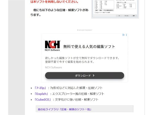 そんな中、実は窓の杜で、ある試みを行っていました。お気づきの方もいるかもしれませんが、少し前から「Lhaplus」の紹介ページに、より安全な選択肢として「7-Zip」などの誘導リンクを設置していたのです。これが功を奏したのかはわかりませんが、もしかしたら多少なりともPV数に影響があったのかもしれません。