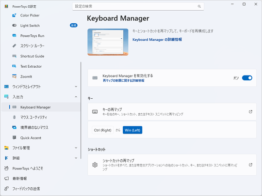 [Windows]キーがない場合は、「PowerToys」の「Keyboard Manager」であまり使わないキーを[Windows]キーに割り当てておくのがおすすめ。右[Alt]キーや右[Ctrl]キーならば[/]キーとも近いのでちょうどよいのではないでしょうか。