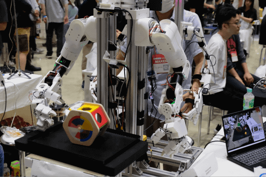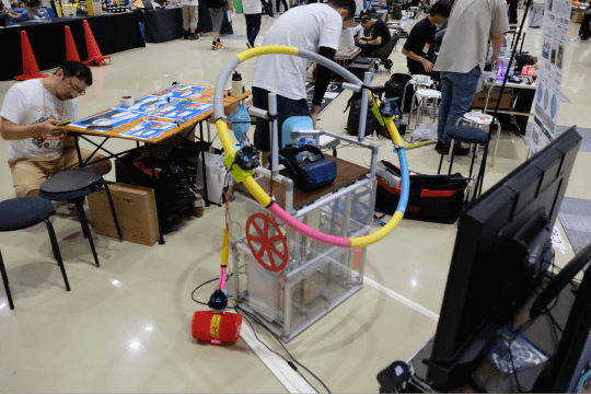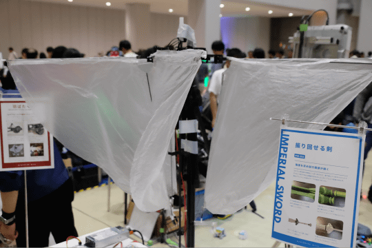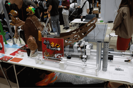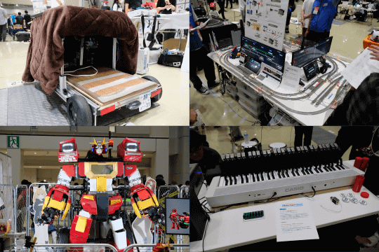 大手自動車部品メーカーのデンソーの社内サークルD's Maker Collegeでは、社員有志による様々な作品を展示していた。なかでもひときわ人気だったのが「VRダルマ落とし」。椅子に座ってVRゴーグルを身につけたプレイヤーがダルマとなり、周りのプレイヤーがハンマーで土台を崩して落とし、風船を割ったり、浮き輪でキャッチしたりして点数を競うゲーム。子どもから大人まで多くの人が楽しんでいた。同サークルブースでは、他にも小型ロボットが迷路をクリアする時間を競う競技「マイクロマウス」などの展示や、似顔絵を自動的にレーザー彫刻でハンコにする装置など、多くの作品が展示されていた。