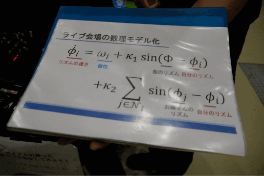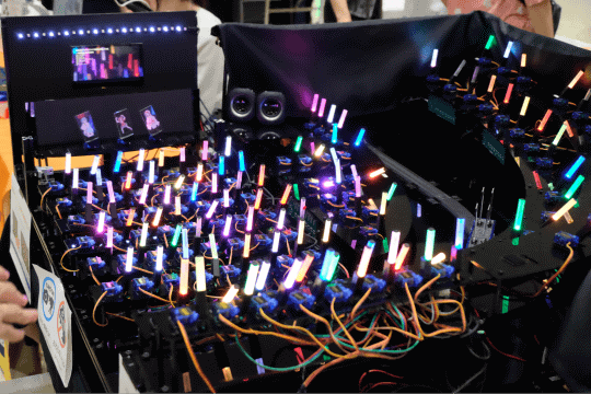 天狗工房の作品は「結合振動子モデルでライブ会場を再現してみた ver2025」。ライブ会場で観客が演奏に合わせてサイリウムを振る様子を数理モデル化し、ロボットによって再現したもの。サイリウムを模したLEDを搭載したロボットは、それぞれアルゴリズムによって個性が与えられており、何も入力がない状態ではバラバラにサイリウムを振っている。それに楽曲のリズムに併せたパルスが入力されると、次第にサイリウムを振る動きが揃っていく。ただし、完全に同期することはなくバラつきがあるため、実際のコンサート会場を見ているかのような雰囲気を味わえるというものだ。