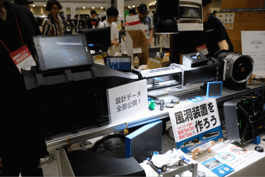 ながれ技術研究所×ストラト・ビジョンという2社による共同ブースでは、空気の流れに関する技術のデモを行っていた。そのひとつはオープンソースの風洞で、同社サイトで配布しているデータを3Dプリンターで印刷し、市販のPC冷却用ファンを利用することで、誰でも風洞が作れるというもの。他にも超音波を使った風速計を複数台連動させることで、空気の流れを可視化する展示もおこなっていた。