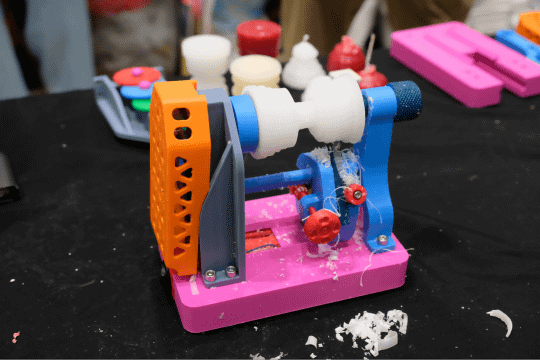 しぶちょー技術研究所では、子どもでも安全に「旋盤」を体験することができる「おもちゃのせんばん工作キット」を展示。3Dプリンター製の部品とモーターと電池で組み立てられ、ロウソクを削ることができる。回転するロウの塊を削り出す操作は、実際の旋盤加工と同様で、大人も子どもも集中して黙々と削り続ける様子が見られた。