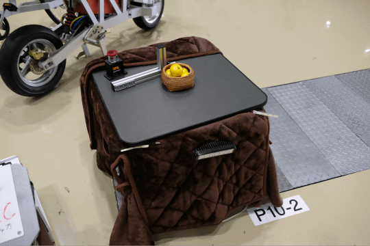 地味な外観ながら会場で存在感を発揮していたのが「こたつ型モビリティ」。高橋クリスのFA_RADIO:工場自動化ポッドキャストが開発したもので、なんと『特定小型原動機付自転車』規格のもとでナンバーを取得しており、実際に公道で走行可能というもの。『こたつから一歩も出ずに通勤通学したい』というコンセプトで開発したそう。