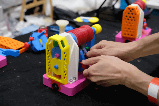 いっせい氏の作品は、『運ぶ』をテーマにしたオリジナルトイ。モーターによる動力だけで、フォークリフトやクレーン、トラックなどが、荷物を運ぶ様子を再現したカラクリ模型。全ての動きの制御は、ギアやバネ、リンク機構などで行われており、モーターとスイッチ以外の電気回路、電子制御は搭載していない。モーターと電池、回転軸などの一部金属部品以外のすべての部品は、3Dプリンターなどで自作したそうだ。設定された経路上をフォークリフトやトラックが自動的に走り、止まり、荷物を積み下ろしをする様子は、非常に完成度が高い。