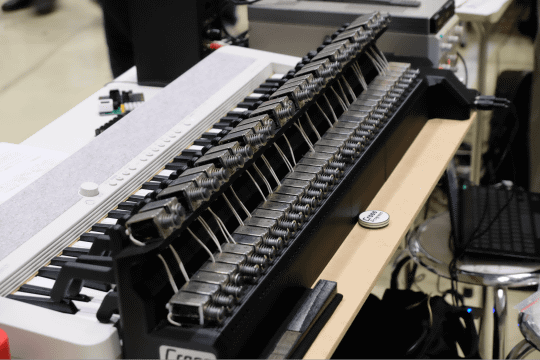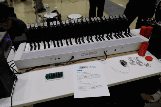 Cross Progress 音楽部 feat. Molinaでは、ソレノイド(電磁石)を使ったキーボードを自動演奏するロボットを開発していた。キーボードのキーひとつにつき、ソレノイドを組み込んだ打鍵機構がひとつ用意されており、MIDI信号を小型コンピューター(M5stack)で処理して、演奏するというもの。鍵盤上にずらりと打鍵機構が並ぶ様子は圧巻で、素早い演奏やグリッサンド、連弾演奏などにも対応できる。