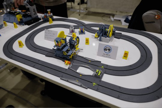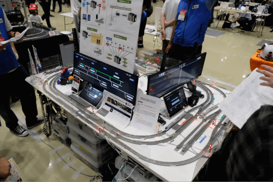 Railway Fan Clubの作品は、鉄道模型(Nゲージ)を用いて、JR西日本の大阪環状線を模した路線の運行状況を再現した自動制御を行うというもの。列車やポイント、信号の制御には、工場などで工作機械を自動制御するための専用コンピューター(PLC)を活用しており、入力した運行予定(ダイヤ)に併せて車両が運行し、駅の案内表示や発車メロディの再生なども行えるようになっている。