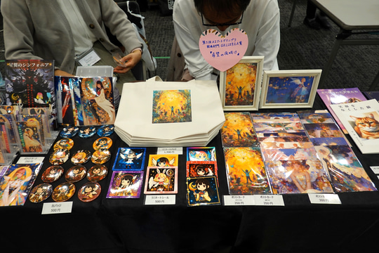 「第三回AIアートグランプリ」絵画部門・GALLERIA賞を受賞し、今年の「AIフェスティバル」のキービジュアルにも採用された、はんなり女史さんのブース。油絵タッチで描く幻想的なAIアートのシールやポストカード、缶バッジなどが販売されていた。
