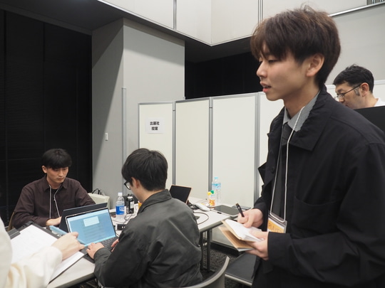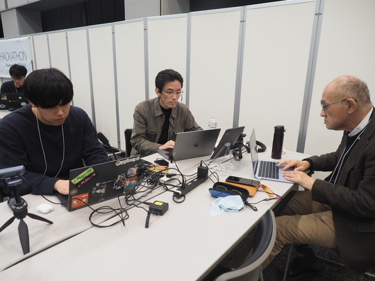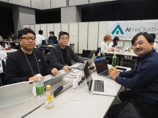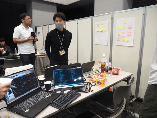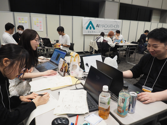 「全日本AIハッカソン2025」は、その名の通り、AIを活用したハッカソンであり、プログラミング知識のない初心者でも、生成AIにコーディングをしてもらうことで、作品を作り上げることができる。昨年の「AIフェスティバル 2024」では、入賞者の表彰式のみが行われていたが(全日本AIハッカソン自体はその前から開催)、今回は「AIフェスティバル 2025」の開催中に、ハッカソンの決勝戦が行われることとなり、チームでお題に取り組む様子が来場者からも見えるようになっていた。