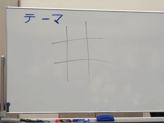 「ハッカソンとは、ソフトウェア開発者やその他の分野の専門家たちが集まり、短時間で新たなプロジェクトを開発するイベントです。これから各チームが作品をこの場で発表し、審査の後に優勝チームが決定します。この優勝チームがどういうことかというと、日本で初めて開催されたAIハッカソンですから、日本最強のAIハッカーであるという十字架をこれから背負っていくことになります。だから非常に緊張しています。どんな人が日本最強のAIハッカーになるのでしょうか。そして今回のハッカソンで、一番重要なのはテーマです。当日まで一切テーマは発表されず、その場で初めて知ってそこから作品を作り上げるというのがハッカソンの醍醐味です。全国5会場での地方大会では全て僕がテーマを考えていますが、これまではずっとホワイトボードに書く直前まで何も考えないようにしていました。今回ばかりは1週間、考えて考えて、最後の3秒で決定しました。そのテーマがこちらです。難しいですね。なんと読めばいいのでしょう。本当は『#』って書いたつもりだったんですが、スタッフが真面目に書いたら、三目並べみたいになってしまいました。いろんな解釈の幅があって、結果的にいいテーマかもしれないと思いました」