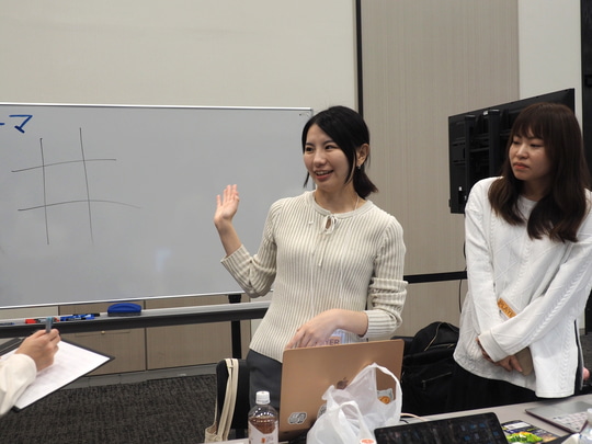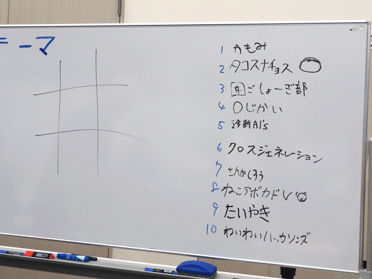 中間発表は、審査員の一人である千代田まどか(ちょまど)さんが、それぞれのチームに進捗を聞くという形で行われた。すでに動作しているプロトタイプを紹介するチームもあれば、まだアイデア出しの段階だというチームもあり、進捗状況はバラバラであった。中間発表後、チームの代表者が運営の大沼功氏とじゃんけんをし、勝ったチームから順に最終発表の順番を選ぶことになった。
