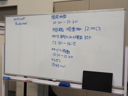 ベルサール秋葉原2Fの一部が開発スペースとして用意されていたが、特にパーティションなどで区切られてはおらず、AIフェスティバルへの来場者から様子が見える形になっていた。