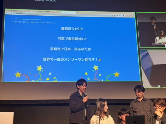 チーム「囲碁将棋部」は、テーマを井戸の「井」と捉え、自分の所属や実績、肩書きなど頑張ったことを入力していくことで、世界で唯一の特徴を持った人間として褒めてくれる「カワズ★オンリーワン」というアプリを開発した。バイブコーディングでプログラムを作成し、普通に計算したら計算できないようなことも、AIがロジックを作って示してくれることがポイントとのことだ。