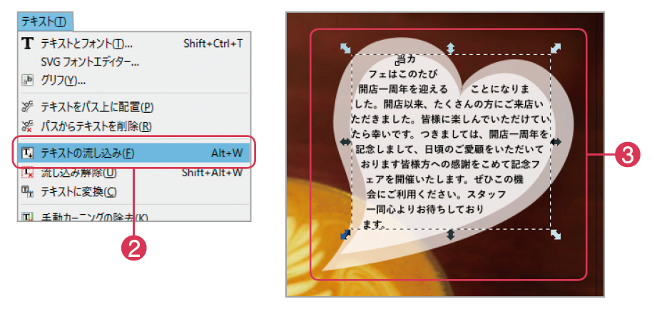 おしゃれカフェ宣伝チラシを制作する! 第4回(全5回):ハート図形に文章を配置しよう