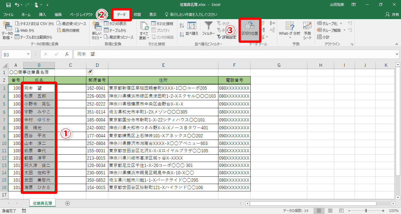 【Excel】1つのセルに入力された氏名の姓と名を別々のセルに分けたい!エクセルで1つのセルを2つのセルに分割するテク(4/9)