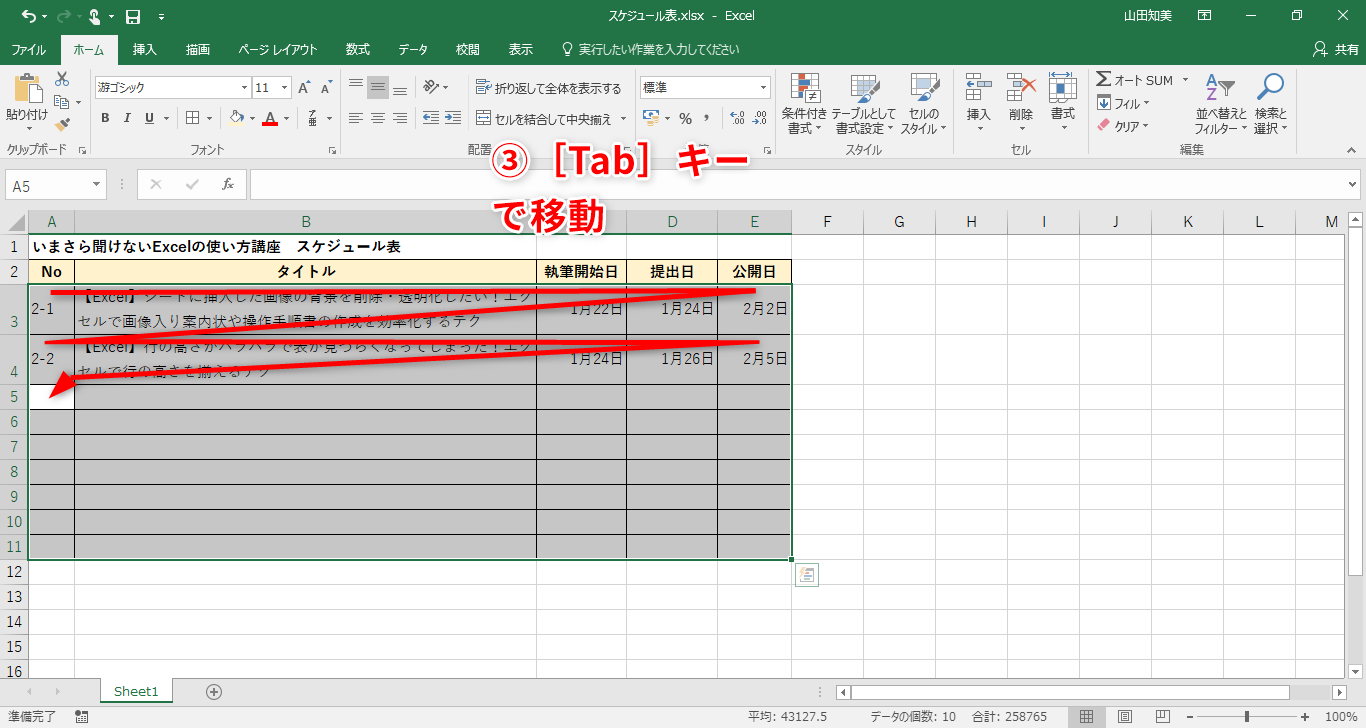 【Excel】アクティブセルの移動を効率化して作業時間を短縮!エクセルで矢印キーやマウスを使わずに次のセルへデータを入力するテク2選