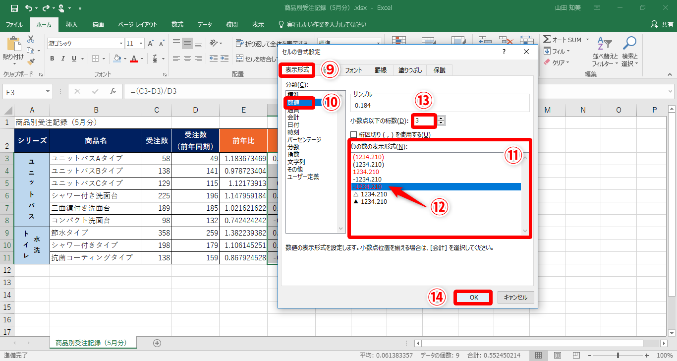 【Excel】受注数が減ったら自動で強調して目立たせたい!エクセルでマイナスの数値に色や記号を付けるテクニック