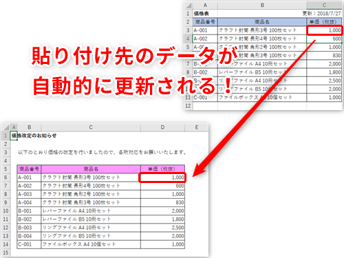 【Excel】価格改定を一度の修正で複数の表に反映したい!エクセルでコピー元を修正すると貼り付け先も更新されるようにするテク