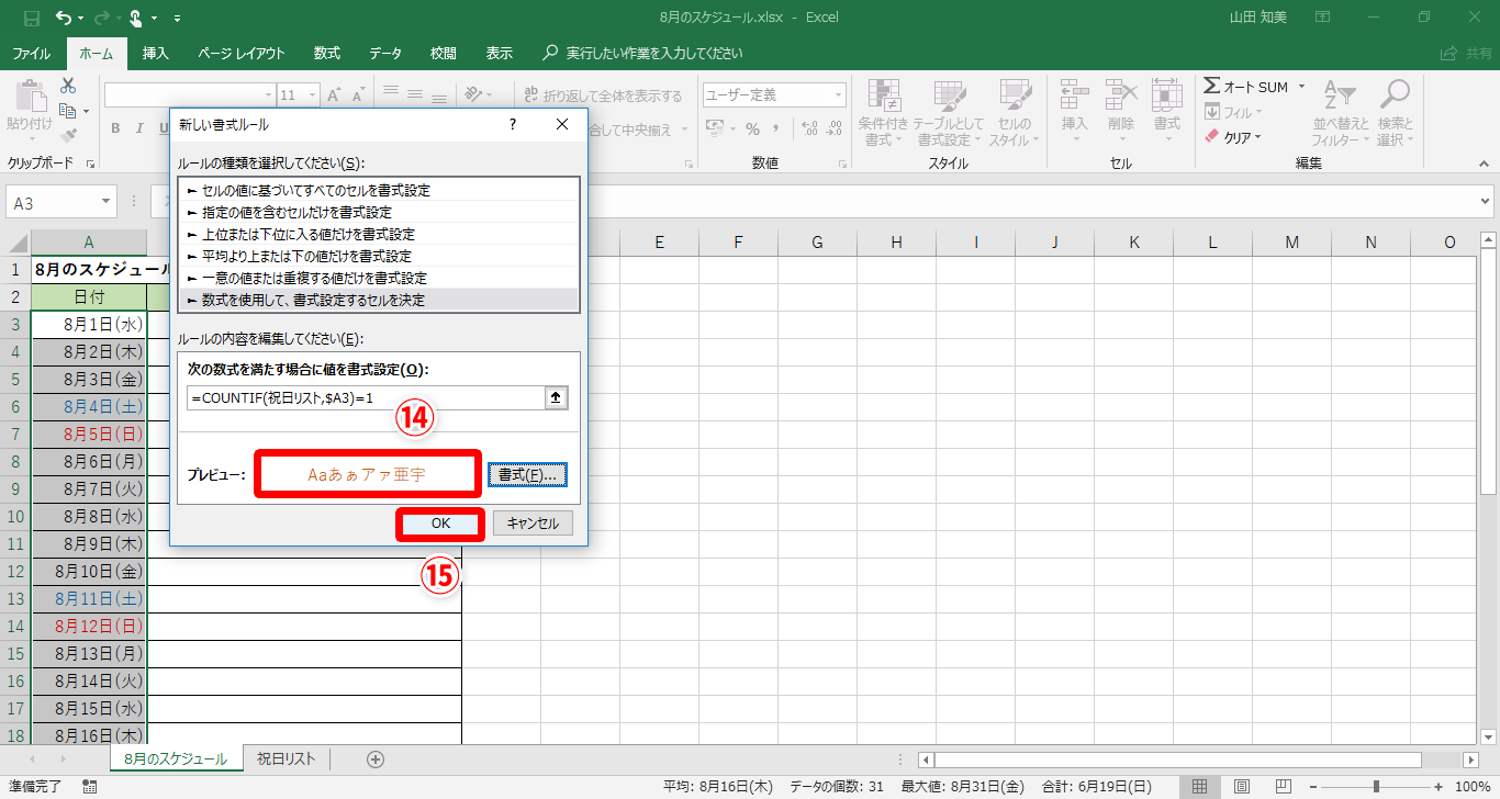 【Excel】スケジュール表で祝日がわかるようにしたい!エクセルで土日だけでなく、祝日の日付にも色を付けるテク