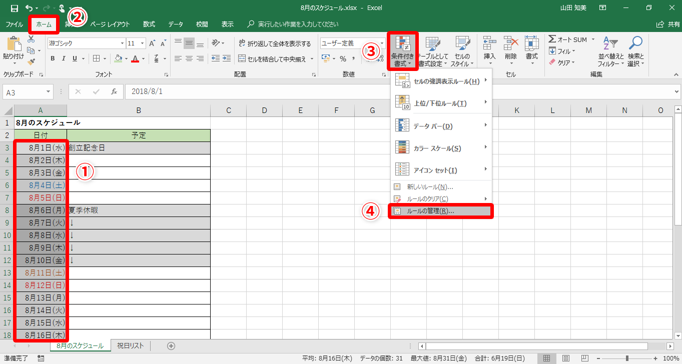 【Excel】スケジュール表で祝日がわかるようにしたい!エクセルで土日だけでなく、祝日の日付にも色を付けるテク