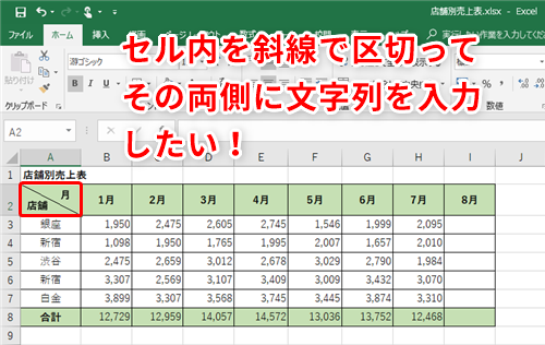 【Excel】列と行両方の見出しを表の左上にあるセル内へ入れたい!エクセルでセルを斜線で分割して文字列を入力するテク