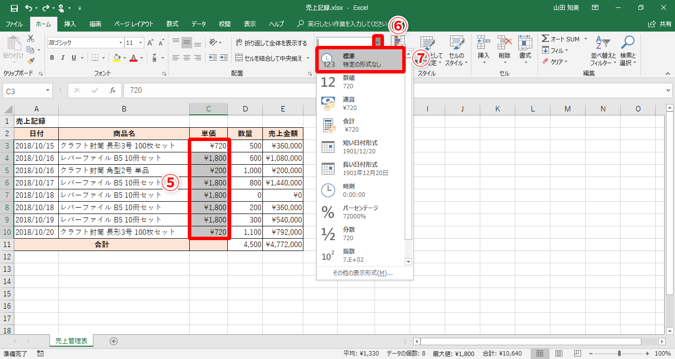 【Excel】「¥」マークや桁区切りの「,」が消せない!エクセルで数値の書式を解除する方法