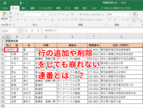 【Excel】行を削除するたびに名簿の連番を振り直すのは面倒!エクセルで行を追加・削除すると自動更新される連番を作るテク