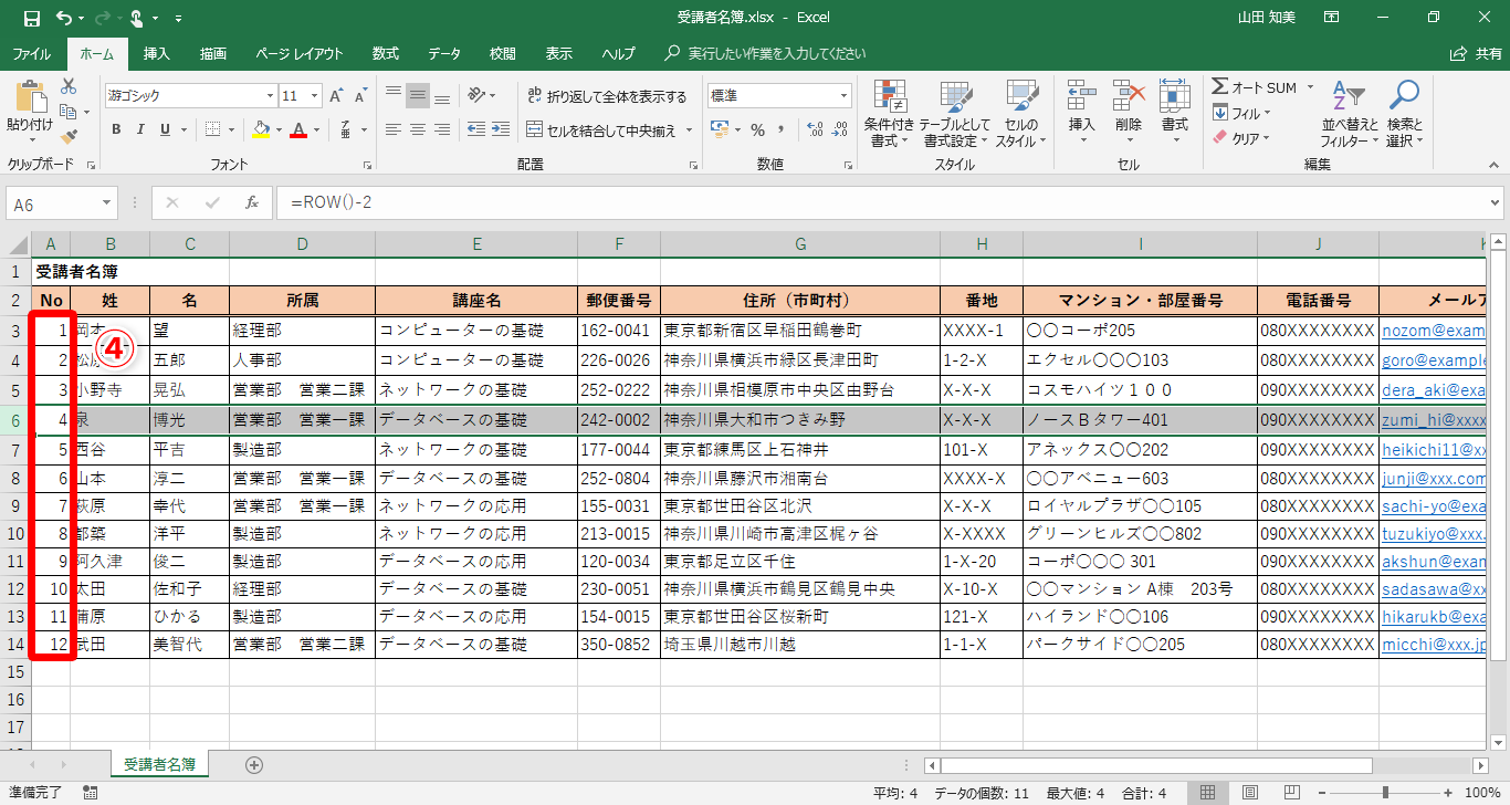 【Excel】行を削除するたびに名簿の連番を振り直すのは面倒!エクセルで行を追加・削除すると自動更新される連番を作るテク