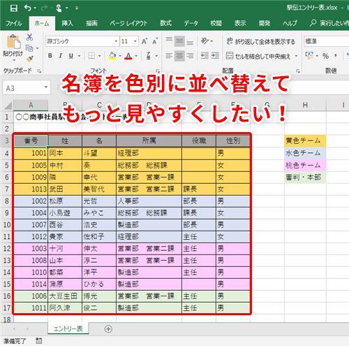 【Excel】表をセルの背景色別に並べ替えたい!エクセルで昇順や降順以外の順番で並べ替えるテクニック