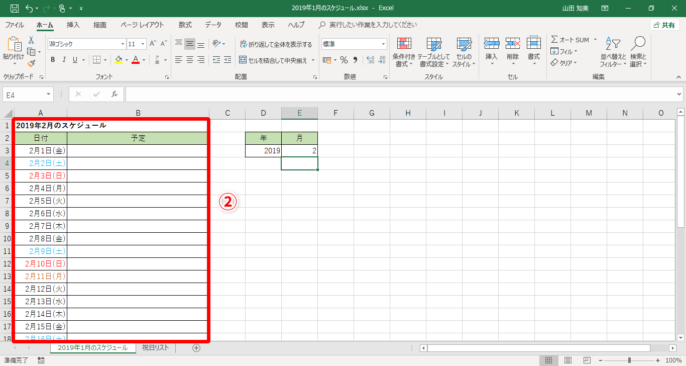 【Excel】スケジュール表の「月」の欄を変更すると日付が自動更新!エクセルで使いまわしに超便利な月間スケジュール表の作成テク