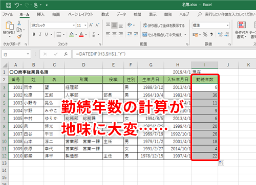 【Excel】勤続年数が自動更新される名簿を作成したい!エクセルで指定した期間の年数を計算するテクニック