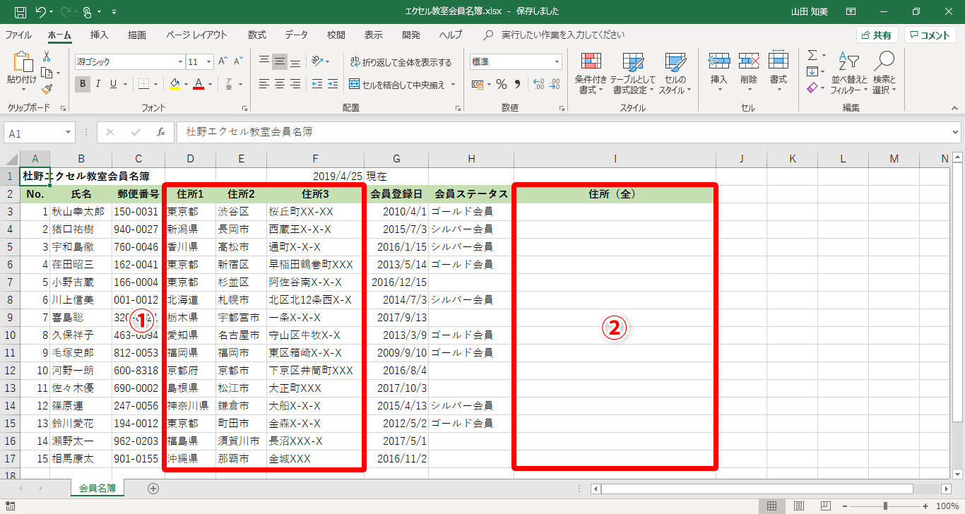 【Excel新機能】3つのセルに分かれた住所を1つにまとめたい!エクセルで範囲指定したセルのデータをラクラク連結するテク