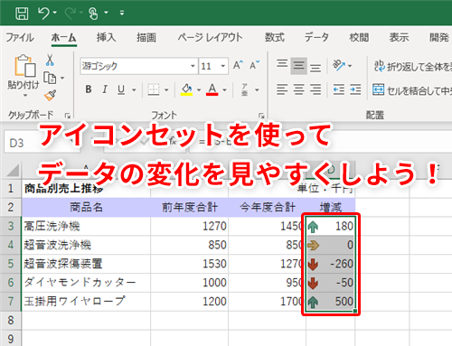 【Excel】数値の増減がパッと見でわかりやすくなる!エクセルでセル内にアイコンを表示するテク