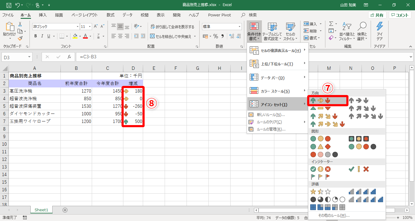 【Excel】数値の増減がパッと見でわかりやすくなる!エクセルでセル内にアイコンを表示するテク