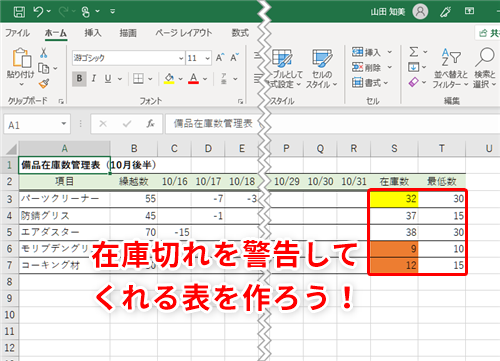 【Excel】在庫が少なくなるとエクセルの管理表が教えてくれる!備品の発注を忘れないためのテクニック