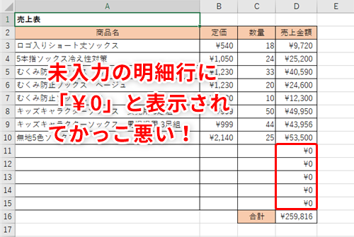 【Excel】未入力の明細行に「¥0」と表示されないようにしたい?エクセルで不要なゼロの値を隠すテクニック