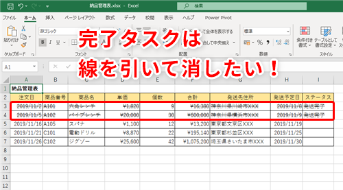 【Excel】完了したタスクは自動で打ち消し線が引かれる納品管理表を作りたい!エクセルの条件付き書式活用テク