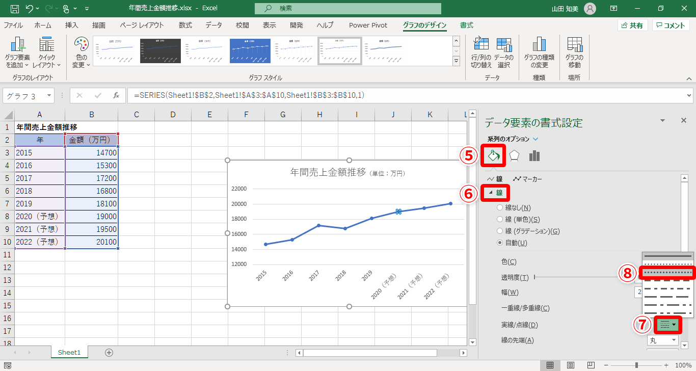 【Excel】折れ線グラフで予想値の部分をわかりやすく表現したい!エクセルでグラフの一部を点線にする方法