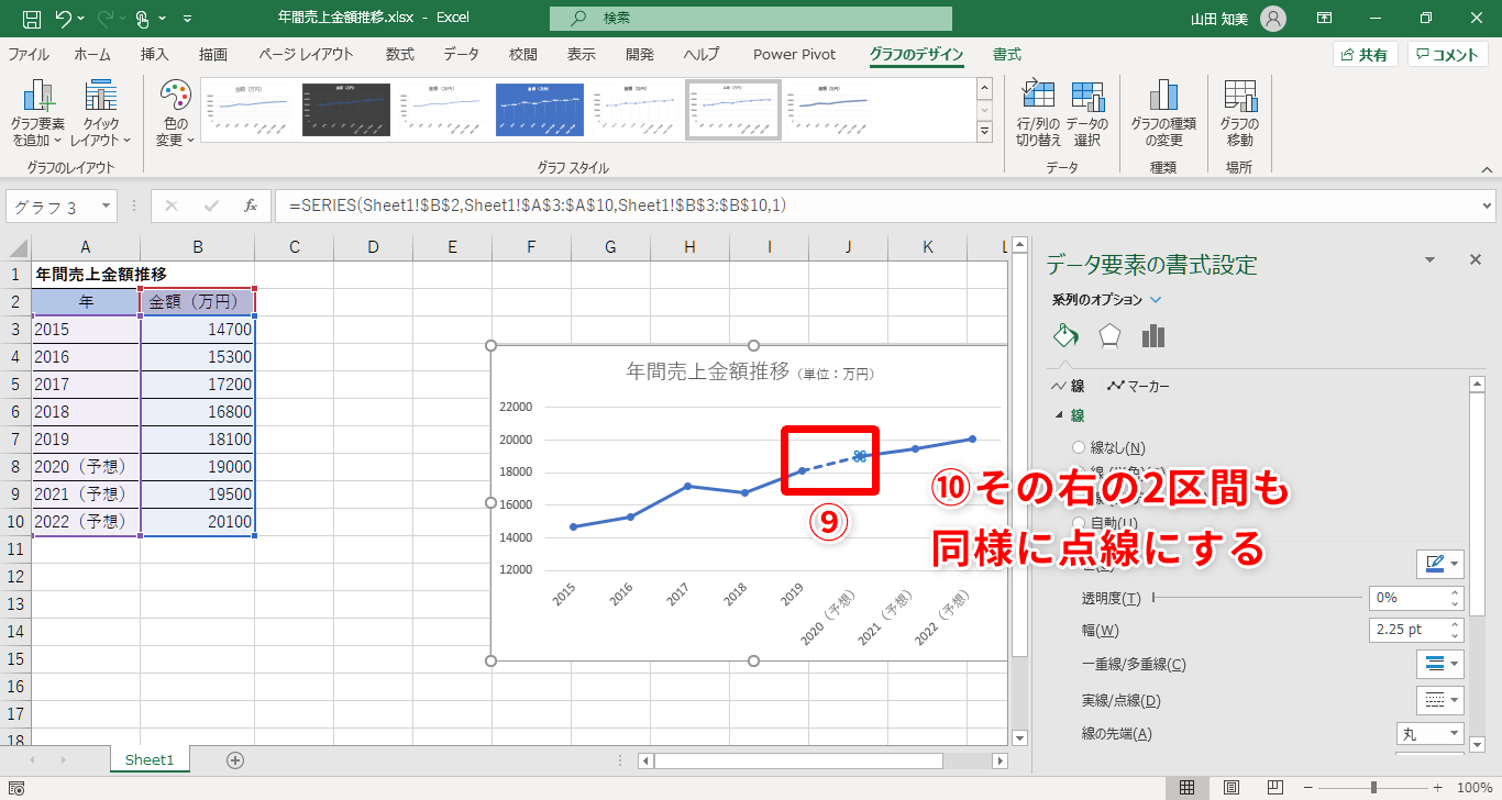 【Excel】折れ線グラフで予想値の部分をわかりやすく表現したい!エクセルでグラフの一部を点線にする方法
