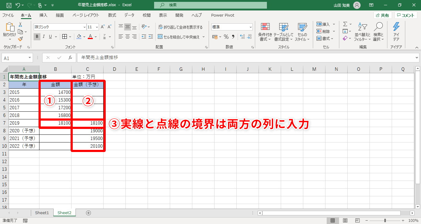 【Excel】折れ線グラフで予想値の部分をわかりやすく表現したい!エクセルでグラフの一部を点線にする方法