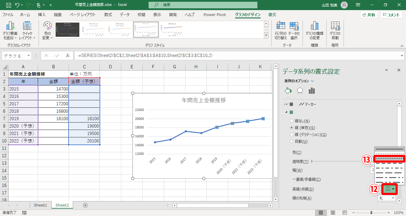 【Excel】折れ線グラフで予想値の部分をわかりやすく表現したい!エクセルでグラフの一部を点線にする方法