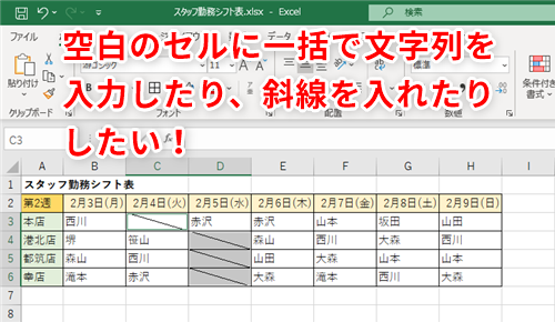 【Excel】シフト表の未入力セルは定休日であることを明示したい! エクセルで空白セルに一括で文字列や斜線を入れるテク