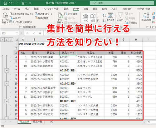 【Excel】SUBTOTAL関数が苦手な人にもおすすめ!エクセルのアウトライン機能で小計を求める方法