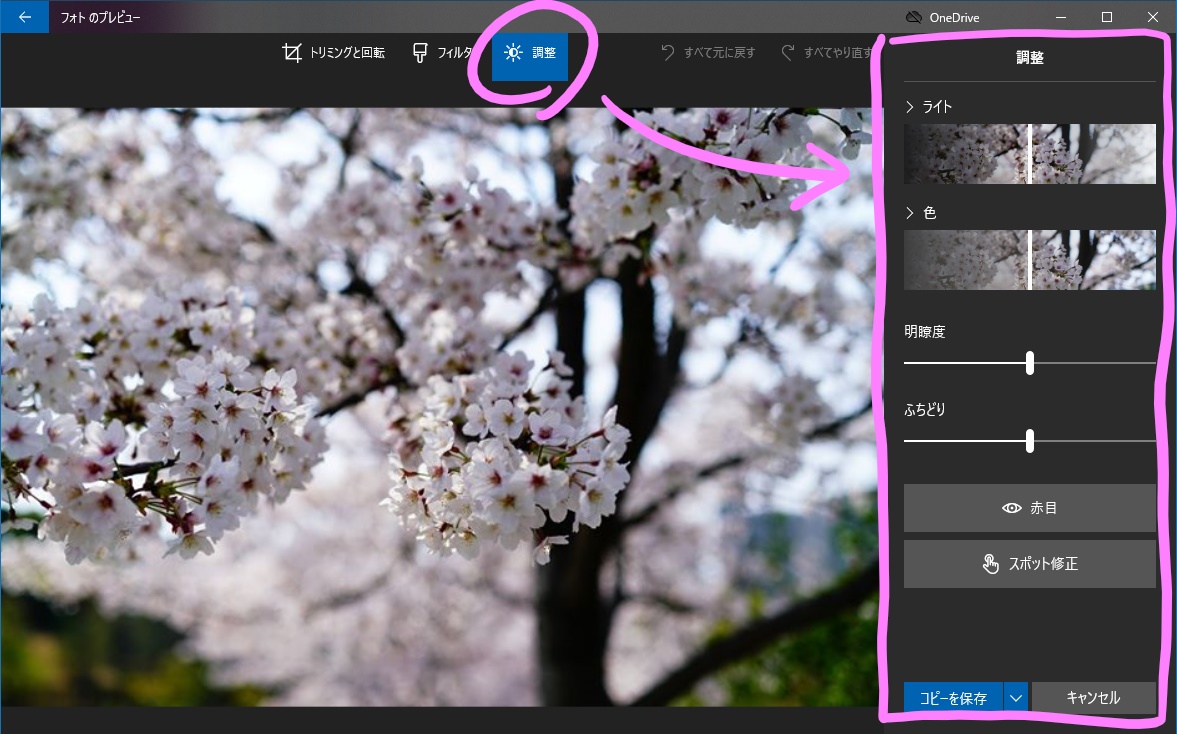 Windows 10の「フォト」を使って残念な桜の写真を美しく仕上げる